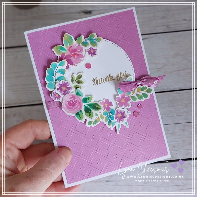8. Wrap Petunia Pop Iridescent Ribbon around the Petunia Pop layer and tie a small bow before attaching the circle to the card front with Dimensionals.