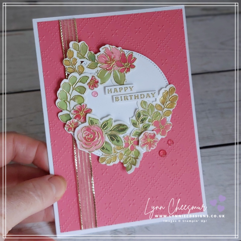 10. Add Gold Striped Mesh Ribbon to the Strawberry Slush layer and add to card front.