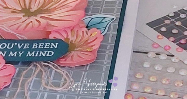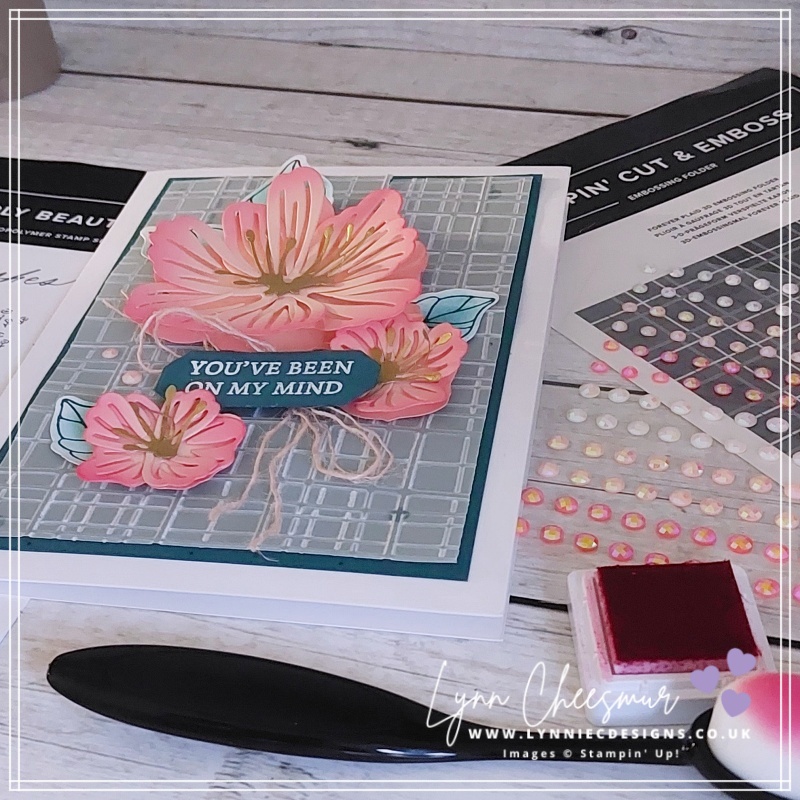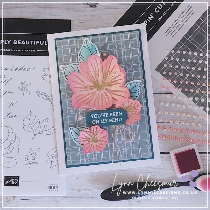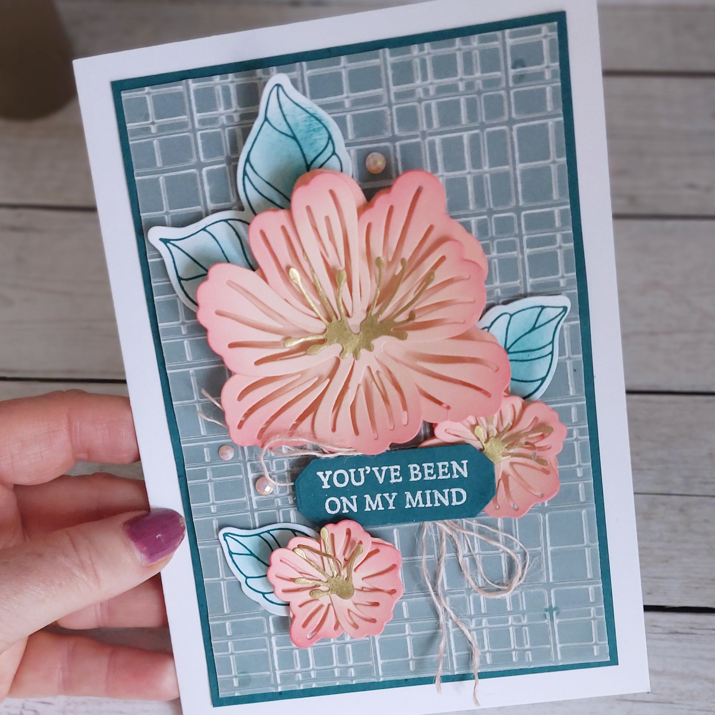 To soften the Pretty Peacock layer, I added texture by embossing vellum with the Forever Plaid 3D Embossing Folder, which allowed the colour to show through while keeping the overall look light. The florals were die cut from Petal Pink cardstock and softly blended with Strawberry Slush around the edges for added depth.
