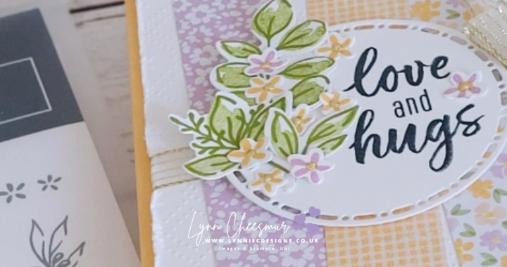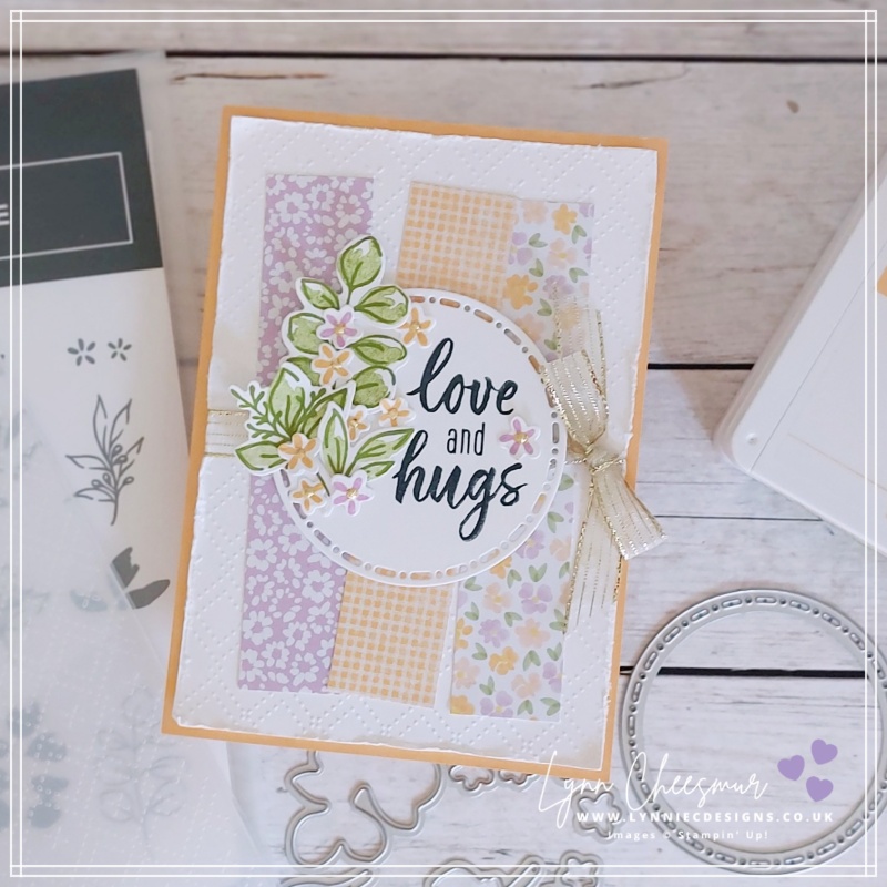 For the focal point, I die cut a circle using one of the Spotlight on Nature dies. Then, using the Greenery Lane bundle, I stamped several leafy sprigs in Old Olive along with clusters of tiny flowers in Peach Pie and Fresh Freesia. After stamping, I carefully die cut the images and arranged them onto the circle using liquid glue.