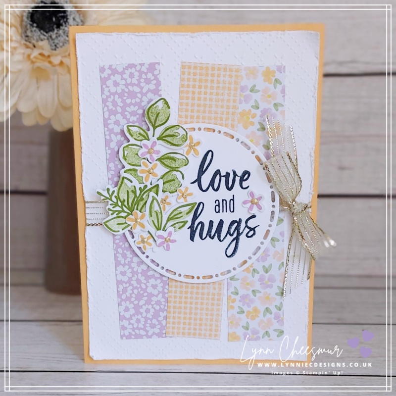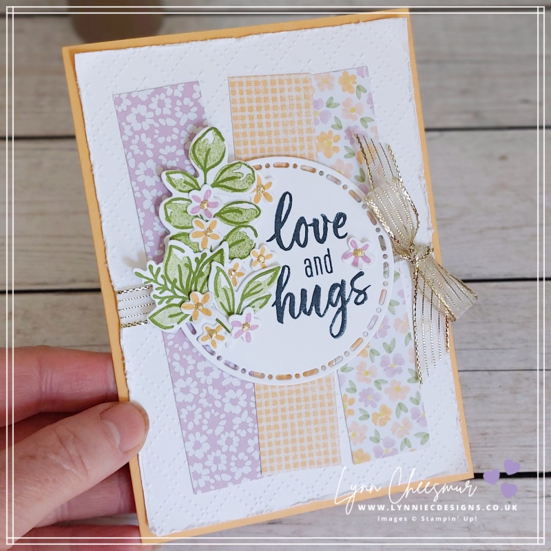 Once the patterned strips were adhered, I wrapped a length of Gold Striped Ribbon around the panel and tied it into a sweet little bow. Not only does this add texture, but it also subtly draws the eye toward the centre of the design.